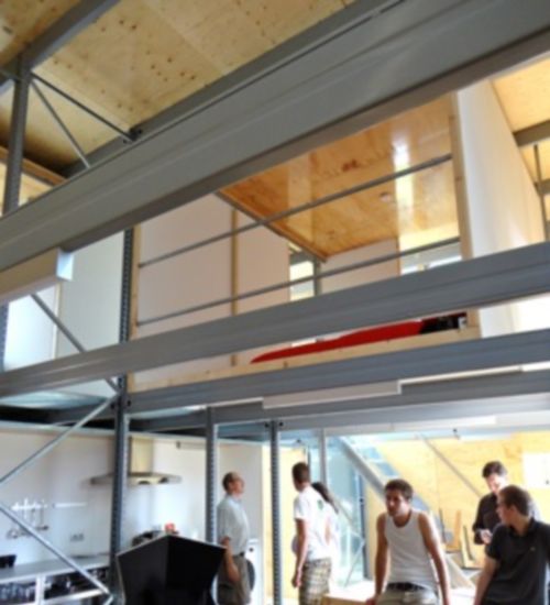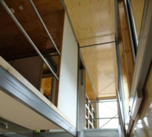 Dom ima veliki unutrašnji podeljeni prostor - doboš rolne - industrijska paleta prostornog sistema, inače poznat kao industrijska polica. Koristi se za podršku drugom spratu, koji se sastoji od spavaće sobe i kupatila. Ova vrsta građevinskog materijala je već prihvaćena u Belgiji. Upotreba police, kako bi stvorila drugi sprat omogućava vlasniku kuće da brzo sastavi ili postavi grede i podove u mestu, bez upotrebe teških mašina. Električni sistem je integrisan u proces montaže i omogućava relativno jednostavan elektro - instalacioni proces.