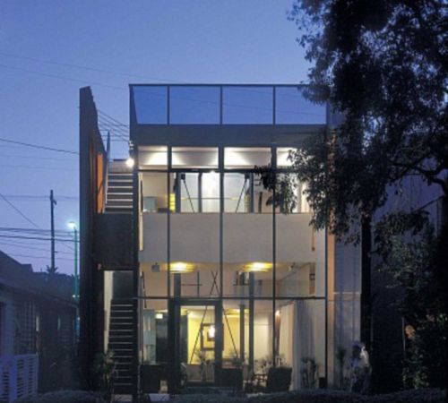 1) Metafora: U svojim zasebnim masama, kuća postavlja opoziciju između studija i boravka: rad / život, nebo / zemlja, ideja / telo. Pokušaj da se ova diskusija vodi kao prikrivena i nijansirana više nego otvorena ili očigledna. Studio je podignut, čisti prostor, obeležen horizontalnim čeličnim perajima i pruža indirektno svetlo kroz tri providna zida. Boravak se može se smatrati čvrsto utemeljenim, uglavnom neprozirnim.