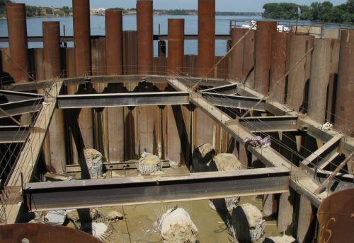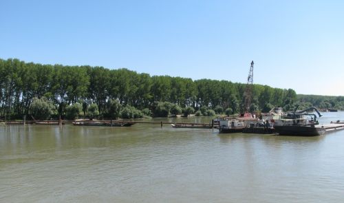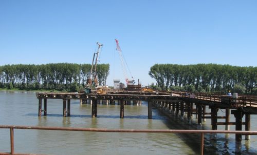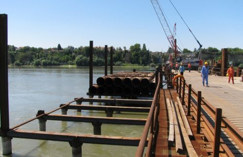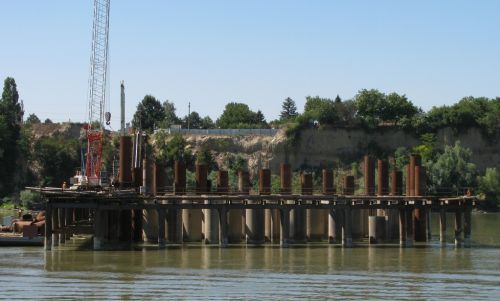 Sa borčanske strane reke završen je prvi par stubova u reci, dok se podvodni betonski radovi izvode na još tri para nosećih stubova. Tehnologija izgradnje je takva da se postavlja čelicni sanduk ili zagat oko mesta za šipove u okviru koga se postavljaju velike čelicne cevi u kojima se buse šipovi i dalje sipa beton. Metalni zagat oko šipova se onda pumpama isušuje kako bi se omogućila dalja gradnja. Kako bi pumpe bile u mogućnosti da isuše zagat, ronioci rade podvodna zavarivanja na zidu sanduka zatvarajući otvore iz kojih prodire voda. U ovom delu radova posebno pomaže rekordno nizak vodostaj Dunava.