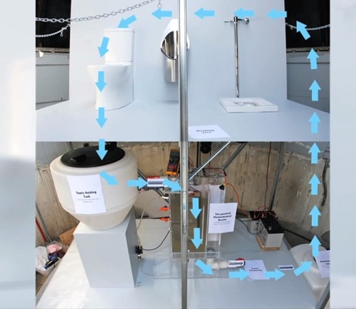 Inženjer Majkl Hofman (Michael Hoffmann) sa Kalteha je sve ove uslove ispunio sa dizajnom solarnog toaleta koji koristi solarne panele kako bi generisao struju koja napaja elektrohemijski reaktor koji razrađuje vodu i otpadne materije u đubrivo i vodonik.