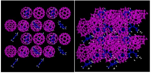 Simulirana struktura "buckyballs"-a (levo) i nova super čvrsti materijal (desno) |