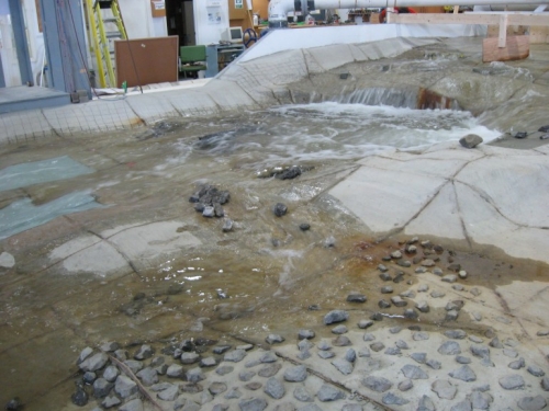Zatim je dodat element bez koga ništa od ovoga ne bi imalo smisla - voda. Moćni pumpe modela su uključene kako bi pokrenule sistem cirkulacije vode. Iako je protok te vode samo umanjena verzija stvare reke, Šepard i njegov tim su ga fino podesili upoređivanjem fotografija i videa stvarne reke sa njihovim modelom. Kao što vidite na fotografiji ispod, krajnji rezultat je bio vrlo sličan.