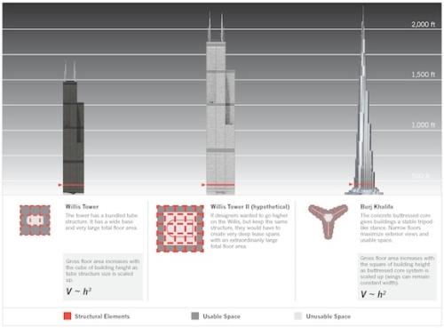 Na osnovu neke brze matematike, ako je zgrada teška samo 15 posto u odnosu na čvrsti objekat, mogla bi biti 6,6667 puta viša a da teži isto kao taj čvrsti objekat. Zgrada bi, hipotetički, mogla da se pone na skoro 59.000 metara a da ne bude teža od Mont Everesta ili da sravni samu zemlju ispod nje. Zar ne?