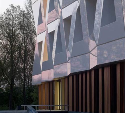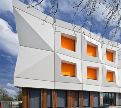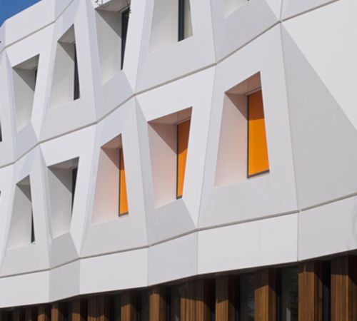 Zgrada je prvo bila konstruisana kao policijska stanica 1970. godine. Novi dijagonalno savijeni fasadni paneli imaju ulogu zaštite originalne strukture i obezbeđuju prostor za dodatnu izolaciju.