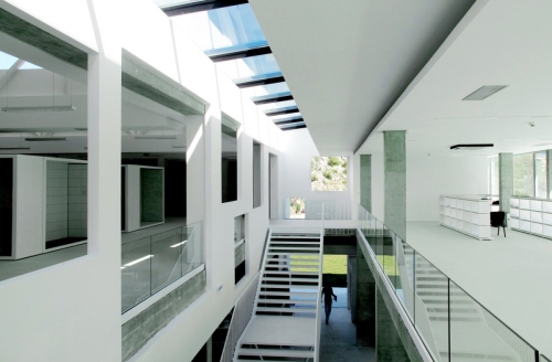 Zenitalno osvetljeni pojas koji predstavlja vezni segment objekta pruža okvir za događaj kompaktnog centralnog hola koji povezuje sve klijenima dostupne zone objekta.
