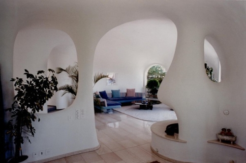 Podrum i garaža su izgrađeni konvencijalnim sredstvima, dok je prizemlje izgrađeno korišćenjem prskanog betona (shotcrete). Izolacija je obezbeđena sa slojem reciklirane staklene vune, dok polimerni bitumen otporan na prodor korenja nanešen na prskani beton čini celu kuću vodootpornom.