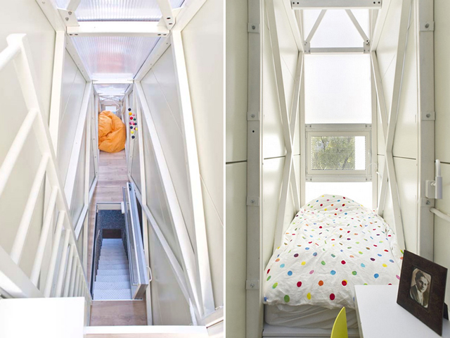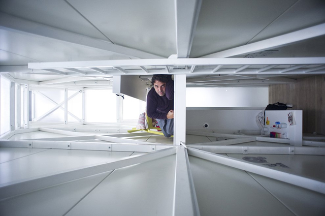 Kuća je na tri sprata koji su povezani merdevinama. Na prvom nivou je kuhinja sa kupatilom i prostorom za obedovanje. Na drugom je spavaća soba sa radnim stolom, a postoji čak i mini potkrovlje za odlaganje stvari. Enterijer je ofarban u belo, kao i spoljašnjost kuće.