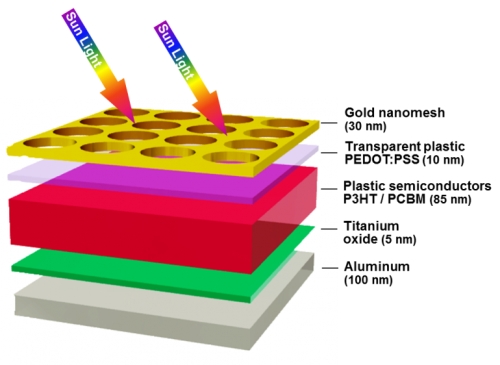 Sastoji se od pet veoma tankih slojeva. Na vrhu je "prozorski sloj" kroz koji sunčeva svetlost prvo prolazi. Napravljen je od izuzetno fine metalne mrežice čiji se prečnik i razmak rupa meri u nanometrima. Sledeći je sloj providne plastike, a zatim sloj poluprovodnog materijala - iako je profesor Čou koristi plastične poluprovodnike, drugi materijali se mogu koristiti. Ovo je praćeno slojem titanujum oksida, sa slojem aluminijumskog kućišta na dnu gomile.