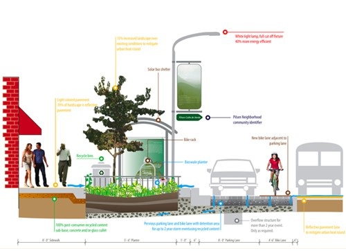 Ulica prolazi kroz industrijku zonu koja povezuje državu i savezne autoputeve i, iako nije podložan za kvalifikaciju za LEED sertifikaciju zato što nije objekat, projekat će snimiti merljive rezultate kroz niz jednako agresivne održive ciljeve, mereći osam performansnih oblasti kao to su upravljanje kišnicom, ponovno korišćenje materijala, smanjenje potrošnje energije, i izrada na licu mesta.