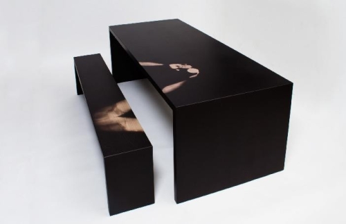 Sto i klupe su presvučeni u termohromskom finišu - to znači da oni menjaju boju kada se zagreju, baš kao i majice i prstenje. U ovom konkretnom slučaju, završna obrada menja boju iz crne u providnu, omogućavajući drvenim godovima da se vide kada je nameštaj izložen telesnoj toploti.
