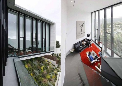 Zgrada se sastoji od dva sprata sastavljena od dva pravougaonika koji se seku, plus krovne terese i bazena koji se nalazi ispod. Možete ući u kuću preko gornjeg sprata, koji se nalazi pored puta koji ide duž brda i iza kuće. Tu je i garaža za dva automobila, spavaća soba, kupatilo i radna soba koji svi zajedno čine gornji sprat.