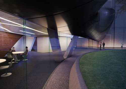 Kružno centralno stepenište će povezivati čitaonicu koledža u prizemlju sa arhivom biblioteke koja se nalazi na prvom spratu. Suteren će imati amfiteatar za predavanja koji prikazuje vertikalni pokret poda kroz ponavljanje talasastih, drvenih plafonskih instalacija koje krase plafon.