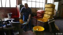 Ispred fabrike može da se oseti tipični miris, poznat svakom ko je na bilo koji način već bio u dodiru s linoleumom. Oksidacioni proces lanenog ulja. Sastojci od kojih se proizvodi linoleum su prirodne i obnovljive sirovine, naglašava Meik: juta iz Indije, Bangladeša ili Pakistana, smola iz Azije, laneno ulje iz Kazahstana i Ukrajine. „U Nemačkoj se snabdevamo piljevinom i vapnencem.