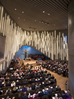 Glavni korpus zgrade se spiralno izvija u nivoe koji se sa porastom visine smanjuju i na kraju kulminira u cevasti toranj, sa zvonikom 47 metara iznad tla. Dnevno svetlo ulazi u zgradu preko vitkih duguljastih prozora koji su raspoređeni nalik crnim dirkama crkvenih orgulja.