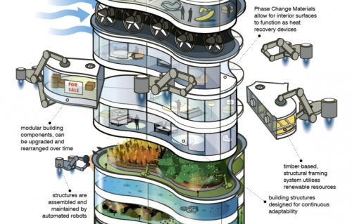 Zgrada budućnosti će karakterisati konstruktivni ram i međuspratne ploče na bazi drveta koji opslužuju modularne građevinske komponente koje mogu biti pomerane ili menjane u svakom trenutku. Na unutrašnjim površinama će biti korišćeni materijali sposobni za faznu promenu koji imaju mogućnost da olakšaju povraćaj toplote. Takođe, koji neboder budućnosti bi bio potpun bez robota? Oni se pojavljuju kao sastavni deo zgrade, projektovani da montiraju i održavaju njene komponente.
