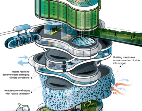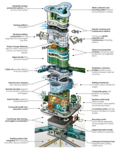 Ono što je zanimljivo jeste da je Arup zamislio zgradu budućnosti koja proizvodi više nego što troši. Pored održive gradnje, projekat ima fotonaponske sposobnosti (koji će po svemu sudeći biti dostupni u obliku farbe 2050. godine) koje hvataju i prenose energiju pomoću gorivnih ćelija na licu mesta. Pored toga, energija će se sakupljati i od liftova ili sličnih unutrašnjih sistema, zajedno sa vetrogeneratorima i mahunama koje proizvode bio-gorivo uz pomoć algi.