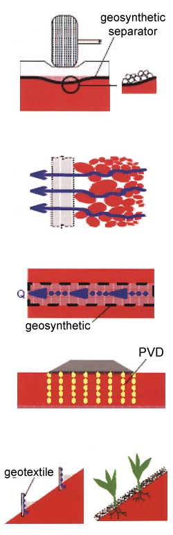 Filtracija – geosintetika sprečava finu migraciju čestica zemlje u drenažni sloj ili geocev. Ona se, takođe, koristi ispod kamenog nasipa kod rečnih obala kako bi sprečio eroziju zemlje. Drenaža – geosintetika služi kao odvod koji sprovodi tok vode kroz manje propustljivo zemljište. Ona npr. služi da raspe pritisak vode na osnovu nasipa kolovoza. Ukoliko je tok vode jači preporučuje se upotreba geokompozita. Prefabrikovane drenažne cevi PVD (prefabricated vertical drains) koriste se da ubrzaju konsolidaciju mekanog kohezivnog temeljnog tla ispod nasipa. Ojačanje – geosintetika služi i kao ojačavajući sloj u zemljištu kojim se poboljšava čvrstoća i deformabilnost zemljišta. Geotekstil i geomreže služe da zemljištu poboljšaju čvrstoću na zatezanje da bi formirali ojačani zemljišni zid. Ojačanje zemljišta omogućava da se izgrade nasipi i preko meke i slabo nosive podloge ili da se kosina nasipa izgradi pod strmim uglom što se ne bi moglo uraditi kod neojačanog zemljišta. Geomreže mogu da se koriste i da bi se premostile šupljine koje se mogu pojaviti ispod nosećeg sloja kod puteva i železnica kao i kod pokrivnog sloja kod deponija. Barijera za tečnost/gas – geosintetika se koristi i kao nepropusna barijera za tečnosti i gasove. Glineni geosintetički materijal GCL se koristi kao barijera za prodor neke tečnosti ili gasa u tlo. To se može primeniti i kod gornjeg sloja asfalta u sprečavanju bubrenja zemljišta koje bi moglo ugroziti gornji sloj asfalta. Erozija – geosintetika sprečava eroziju tla izazvanu uticajem padavina i oticanjem površinskih voda. Biomat i geomat se postavljaju preko gornjeg sloja zemljišta na kosinama. Ostale funkcije – geomreže za ojačanje gornjeg sloja asfalta, zaštita hidroizolacije i geomembrana od proboja, hidroizolacija temelja betonskih konstrukcija membranama na bazi bentonita... Geosintetika je tako rešenje za brojne konkretne probleme sa kojima se suočavaju stručnjaci u oblastima niskogradnje, ekologije, prostornog planiranja... Mnogobrojni su primeri gde se primenjuju različiti geosintetički pro izvodi (zavisno od zahteva i namene objekta): potporni zidovi, spečavanje klizišta i odrona tla, zaštita poljoprivrednog zemljišta, zaštita i obezbeđenje dugotrajnosti puteva i železnica, objekti hidrogradnje, sakupljanje i čuvanje pitke vode, prenos i transport vode, smetlišta i lagune za otpad, itd. |