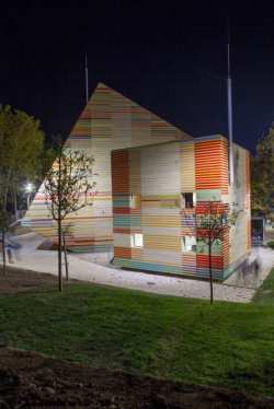 Ceo auditorijum, koji je izgrađen od stotinu drvenih greda, prefabrikovan je u Trentu i zatim spakovan i transportovan do Akvile gde je na licu mesta sklopljen. Sve tri kocke su napravljene u potpunosti od specijalno tretiranog drveta koji štiti od homogene oksidacije i napravljene su da izdrže zemljotrese. Pored toga, 90 drveća je zasađeno pored auditorijuma kako bi se nadoknadilo drveće koje je korišćeno za izgradnju projekta.