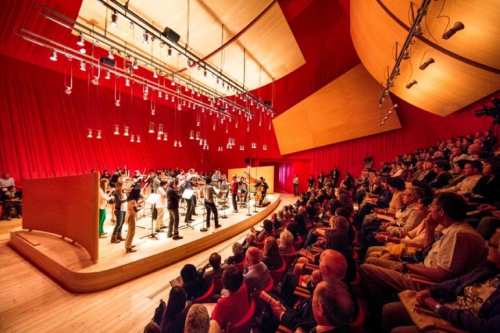 Unutar koncertne dvorane, zidovi su opremljeni nizom visećih akustičnih panela od sirovog drveta koji su orijentisani ka publici kako bi reglektovali zvuk unutar auditorijuma. Pored toga, dva akustična zida od po oko dva metra visine su pozicionirana tako da odražavaju zvuk ka orkestru, osiguravajući optimalnu akustiku.