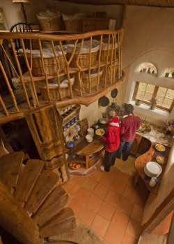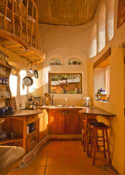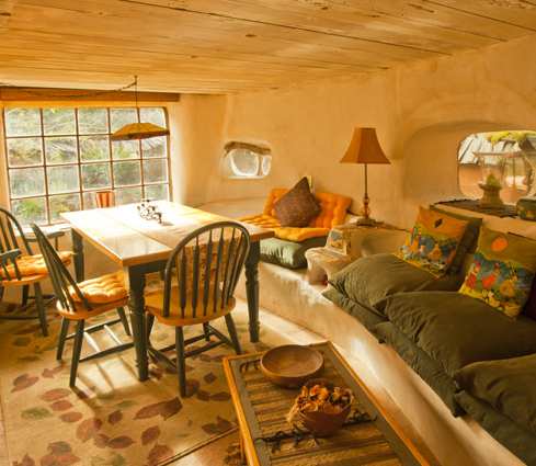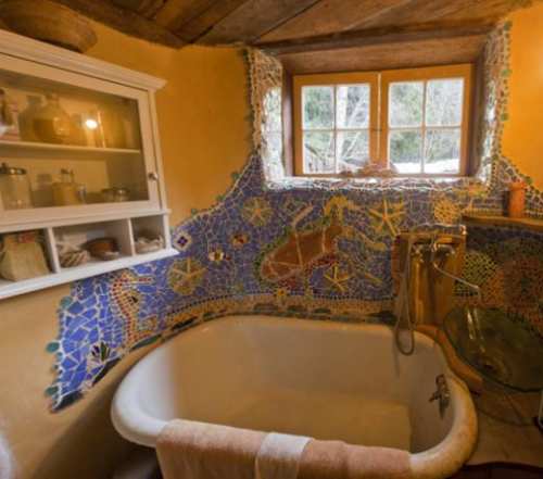 U kupatilo se nalazi ručno izrađen mozaik, a širom kuće se mogu videti mnoga umetnička dela napravljena od koba. Na vrhu kuće se nalazi zeleni krov koji pruža dodatnu toplotnu izolaciju.