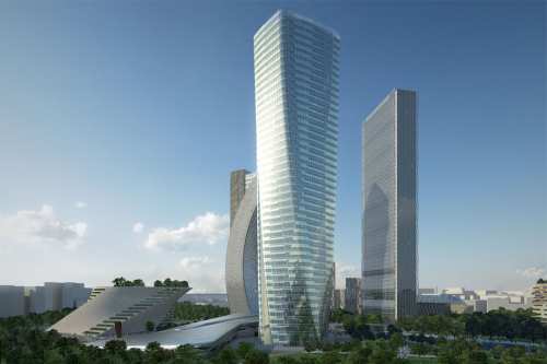 Neboder će biti izgrađen pored nebodera Arata Isozaki & Associates Tower (pravi) od 220 metara i nebodera Daniel Libeskind (krivi) od 150 metara, i sadržaće komercijalne i poslovne prostore, kao i šoping zone koje povezuju metro stanicu.