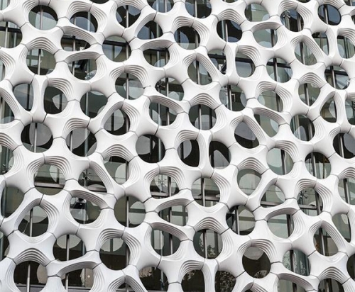 Neregularni i biomimetički obrazac pločica proističe iz kvazikristalne, ili penrose, mreže zasnovane na sunđerima i koralima. Obrasci su prvo nacrtani u 2D u CAD programima, a zatim modelovani u programu Rhino. Uprkos svojoj vizuelnoj kompleksnosti, oni se sastavljaju primenom standardnih pravila postavke pločica na fasadama i montiraju se na vertikalnoj mreži. Prvi otisci, nastali 2006. godine, bili su stereolitografi (SLA) koji je studio ručno izlivao od poliuretana.
