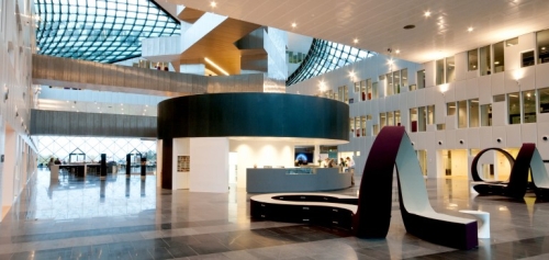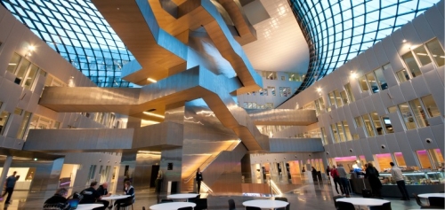 Ovaj aranžman sa sobom nosi određene inherentne prednosti. Prvo, svaki od pet blokova ima jedinstvenu orijentaciju i pogled. A prostor između pet blokova stvara atrijum koji je pokriven sa talasastim staklenim krovom u obliku propelera. U skladu sa popularnom teorijom menadžmenta, zgrada je projektovana tako da se zaposleni kreću preko atrijuma kada dolaze i odlaze, negovajući na taj način slučajne susrete za koje nam je rečeno da kultivišu inovacije.