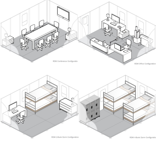 Kao i Modularflex sklonište o kome smo skoro pisali (tekst na linku ovde), RDM se isporučuje kao samostalna jedinica. U slučaju RDM-a, sam transportni kontejner se koristi kao baza skloništa. RDM poseduje čvrste zidove, podignute podove i ventilisani platneni krov. Prozori i vrata na zaključavanje bi trebalo da pruže koliko toliko dodatnu sigurnost u odnosu na platneni šator, a životni vek svake jedinice je procenjen na deset godina.