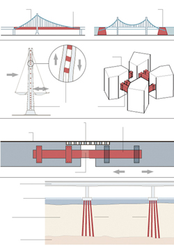 Taj dizajn uključuje i pilon visećeg mosta visine od 160 metara koji se sastoji od četiri čelične osovine koji se ljuljaju u slučaju velikog zemljotresa i do pet metara na vrhu. Ali najveći teret sile bi se aposorbovao spojenim pločama između, nazvanim smičućim vezama (shear links).