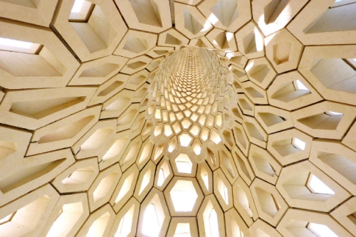 Saćasti obrazac je stvoren korišćenjem prefabrikovanih betonskih blokova kako bi se formirala kolekcija šestougaonih sekcija. Unutra je prostorni atrijunm osvetljen prirodnom svetlošću zahvaljujući prigušenom senčećem efektu koji obezbeđuje omotač.