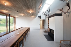 Veliki svetlarnik u zelenom krovu preplavljuje unutrašnjost sa dnevnom svetlošću. Enterijer je oskudan i jednostavno dekorisan sa belim zidovima i drvenim nameštajem. Nama u redakciji se definitivno ne dopadaju trofeji životinja korišćeni kao dekor, ali možemo da cenimo dobar projekat ukopane kuće sa zelenim krovom.