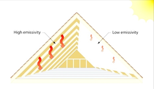 Zračeće barijere su često postavljane u tavanima kako bi održale te prostore hladnijim. Sloj reflektujuće folije može biti smešten na donju stranu rogova ili krovnih rešetki, ili se reflektujuće obloge mogu postaviti tako da su reflektujuće površine okrenuta ka negrejanom tavanu.