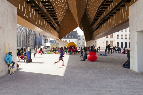 „To je veliki objekat, ali je i trg veliki. Okružujuće zgrade su čak i veće. Da smo napravili manju zgradu, samim tim bi i pokriveni deo trga bio manji. Perspektive zgrade sa okolnih ulica i trgova su odlične. Ima interesantne šiljke na Belfort tornju i krije ružnu fasadu gradske skupštine. Ne razumem zašto se ljudi stalno žale da ima previše materijala koji se koriste. Zgrade ovih dana su sastavljene od slojeva i slojeva i slojeva materijala. U ovom slučaju: betonskih stubova, čeličnih elemenata krova i drvenog završnog materijala“, nastavlja M.M.