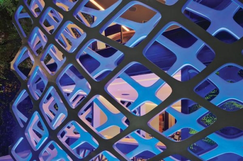 Fasada postaje velika optička varka, kaže Salinas: „Vaše oko se konstantno prilagođava obrascu.“ Dve čelične ravni površine, svaka 8cm debela i na razmaku od 20cm, su ravne metalne ploče. Ali, pažljivo osmišljeni šabloni perforacije, koji variraju od jedne ravni na drugu, stvaraju moire efekat trodimenzinalnosti i čine da svetlost i senka plešu u zamršenoj igri. Noću, fasada menja lik. Plavo osvetljenje između čeličnih ravni osvetljava spoljašnjost zgrade, stvarajući psihodeličan efekat osvetljene paukove mreže.
