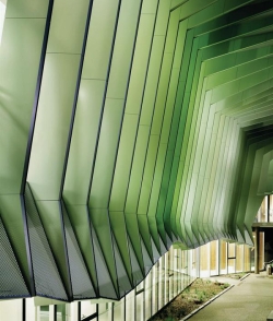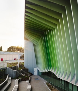 Upadljiva zelena fasada prenosi namenu zgrade bez preteranog isticanja natpisa na njoj. Bruno Mendes, vodeći projektant u birou Woods Bagot, kaže: „Direktori škola su želeli da zgrada privuče pažnju deci istog trenutka kada izađu iz autobusa.“ Skoro 40 metara dugačak sistem se sastoji od 36 talasastih vertikalnih otvora, ili lopatica, obojenih sa paletom zelenih nijansi koje su u suprotnosti sa kontekstom okolnih zgrada koje su od crvene cigle.