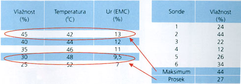 Naravno da je potrebno poći od vlažnosti drveta. Zanemarimo ovde, kao opšte poznat, problem nepreciznosti elektrovlagomera u visokim područjima vlažnosti, već će biti istaknuto nešto drugo. Vlažnost drveta, jer je ono “živ” materijal, varira između dasaka u sušari, varira po debljini i dužini građe. Varijacija vlažnosti po debljini građe je dovela do dva pristupa proizvođ ača opreme: jedni propisuju da se sonde ubadaju na 1/2 debljine, a drugi na 1/3. U prvom slučaju sonde će meriti maksimalnu vlažnost što praktično daje opreznije, ali duže sušenje, a u drugom tzv. srednju vlažnost što je nešto rizičnije, ali brže. Dalje, većina proizvođača grupiše sve vrste drveta u četiri klase što je svakako uopštavanje, i neke vrste jednostavno odstupaju od predviđenih krivih. Varijacije svojstava u okviru iste vrste drveta su dodatni razlog odstupanja, ali i npr. prisustvo reakcionog drveta na mestu gde je sonda ubodena može biti uzrok lošeg merenja.