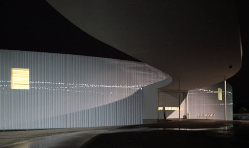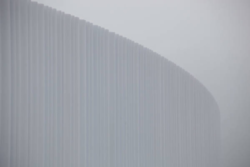 Valoviti omotač zaista u stvari liči na delikatnu glazuru koja pokriva veliku belu tortu, preuzimajući nijanse boje okoline, odražavajući detalje ili ostajući gotovo nevidljiva iza belih cvetova trešnje i olovnog neba. Najsuptilnija igra svetlosti može se posmatrati duž gornje ivice krovne konstrukcije: čak i difuzna sunčeva svetlost prodire u akrilne staklene panele debele 6mm, svetlucajući belu boju nasuprot tamnih oblaka ili dajući kontrast blede sunčeve svetlosti koja ne može da prodre kroz maglu u elegantnoj mat crnoj boji.