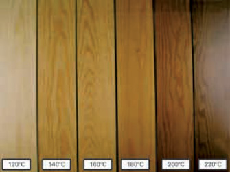 Naime, intenzivan toplotni tretman dovodi do pojave celog dijapazona atraktivnih braon nijansi i tonova TermoDrveta. Uopšteno, kako se vidi na slici, viša temperatura tretmana dovodi do pojave tamnije i bogatije (intenzivnije) boje.