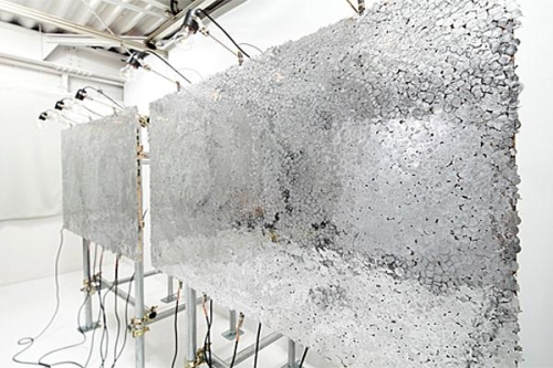 Nakon što se lem ohladio, Okamoto je oljuštio metalnu košu sa podloge i spojio je sa vertikalnim zidnim panelima. U konačnom obrtu, dizajner koristi panele od lema za prenos elektriciteta za osvetlejnje tako što spaja izvore svetlosti instalacije i električne kablove sa provodnim metalom.
