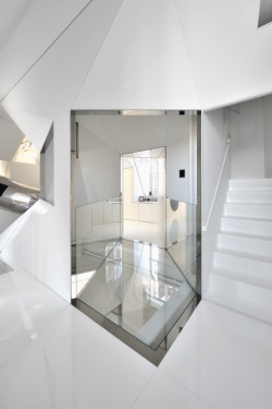 Posetioci SkyHouse apartmana se dočekuju sa privatnim liftom, koji vodi do stepeništa koji se pruža kroz punu visinu potkrovlja, vizuelno povezujući ulazni deo sa staklenim delom apartmana koji se nalazi na četvrtom spratu.