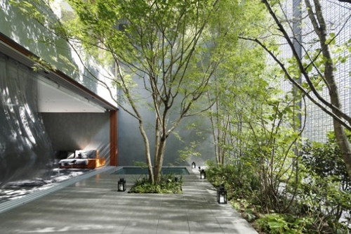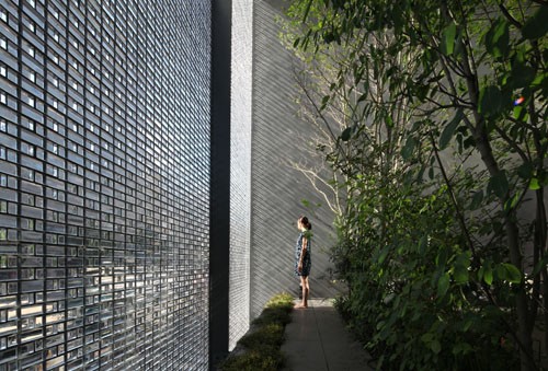 Delikatni stakleni blokovi lažno predstavljaju strukturu, a složen proces livenja je primenjen da stvori fasadu od 13 tona koja prikazuje dvorište ispunjeno drvećem i izgleda kao svetlucavi vodopad spoljašnjem svetu.