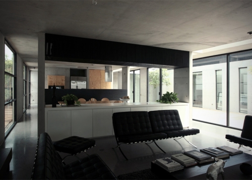 Suprotna strana kuće ima situaciono rešenje otvorenog tipa sa kuhinjom na jednoj strani, trpezarijskim delom u centru i dnevnim prostorom na samom kraju. Staklena fasada okružuje dve strane prostora, tako da stanari mogu lagano da pristupe samom dvorištu.