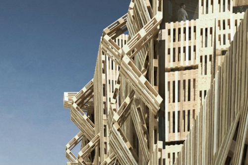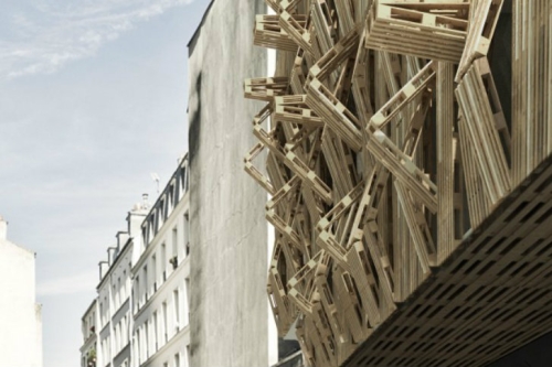 AME-LOT je predlog francuskog arhitekte Stefana Malka da prevuče studentsku rezidenciju u Parizu sa drvenim paletama. Modularna fasada se sastoji od hiljade paleta koje su nanizane zajedno sa šarkama, što im omogućava da se saviju i da budu artikulisani.