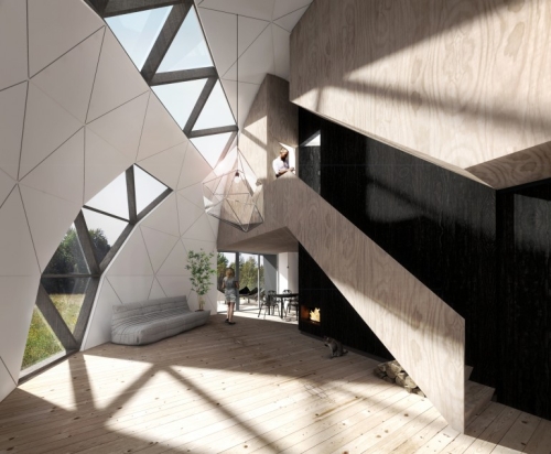 Enterijer kuće ima nezavisnu i samonoseću unutrašnju strukturu, koja ne samo da deluje kao konstruktivni element već i pomaže u deljenju unutrašnjeg prostora u odvojene životne prostore. Centralni deo je napravljen od laminiranog drveta sa metalnim držačima i centralnim dimnjakom koji se probija kroz centar kupole.