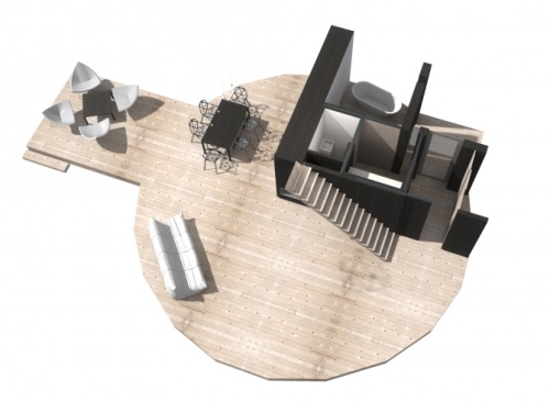 Ona takođe obuhvata drveno stepenište koje vodi do dve izvišene spavaće sobe i nekoliko unutrašnjih zidova koje čine kupatilo, kuhinju i dnevni boravak. Pored toga, kuća ima drvene daske koje se protežu kroz vrata od duplog stakla u mali drveni trem za boravak na otvorenom.
