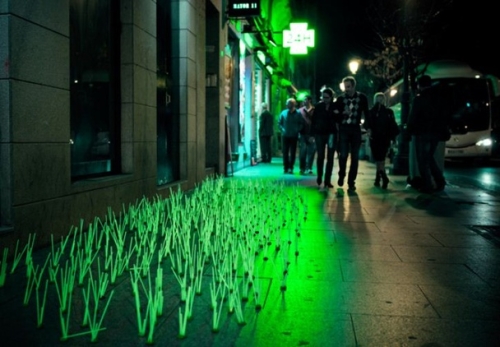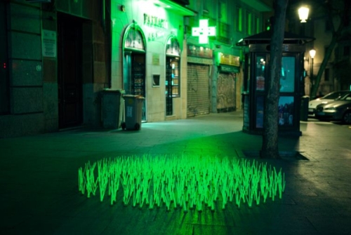 Da li je neko prosuo gomilu nuklearnog otpada na ulicama Madrida? Definitvno tako izgleda sa ova tri polja svetleće trave koja niče na sve strane. Svetleće male livade, od kojih se svaka sastoji od stotina i stotina stabljika žada, pojavile su se krajem marta u centru grada na tri lokacije. Sa svojom ektoplazmatičnom aurom, predstavljaju sjajan spektakl.