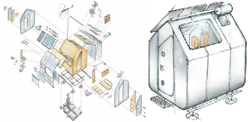 Koliba je napravljena od drveta, a spoljašnjost je obložena sa aluminijumskim panelima. Unutrašnjost je opremljena sa sofom na razvlačenje i sklopivim stolom koji je smešten ispod prozora. Iza particije se nalazi tuš, toalet i mala kuhinja. Samodovoljna koliba poseduje solarne panele, prirodnu vetilaciju i trostruko zastakljene prozore. Voda je obezbeđena od strane rezervoara za sakupljanje kišnice. Jednostavni dom je lak za transport, i lako može biti natovaren na kamion.