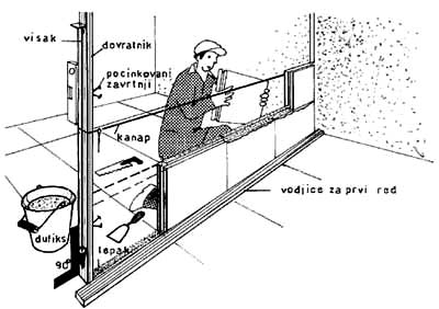 Ako se zid postavlja na obrađen betonski pod treba uraditi i hidro-izolacioni sloj preko koga se postavlja tervol-ploča, a po njoj sloj lepka na koji naleže prva ploča koja se postavlja pomoću libele (sl. 4.4).