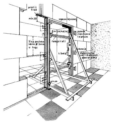 Na sl. 4.7 prikazan je način ugrađivanja dovratnika u pregradni zid i konstrukciju kojom se obezbeđuje vertikalnost i stabilnost konstrukcije do vezivanja zida. U ovom slučaju u spojnice su ugrađene pocinkovane žice ø 3, a ploču iznad vrata nosi pocinkovani T profil.