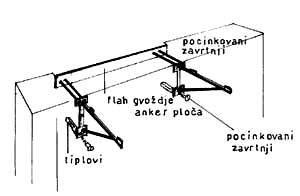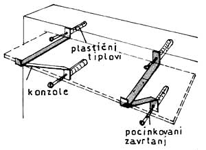 Ovaj problem rešava se tako što se pričvrste pocinkovane sonde oslonjene na podložnu šinu. Šina prihvata horizontalnu silu čupanja sidra i prenosi je na suprotnu površinu zida. Na sidra su zavrnute konzole - nosači lavaboa (sl. 4.8) i bojlera (sl. 4.9). Za predmete manje težine konzole (nosači) su pričvršćene za gipsani zid pocinkovanim zavrtnjima i plastičnim tiplovima (sl. 4.10).